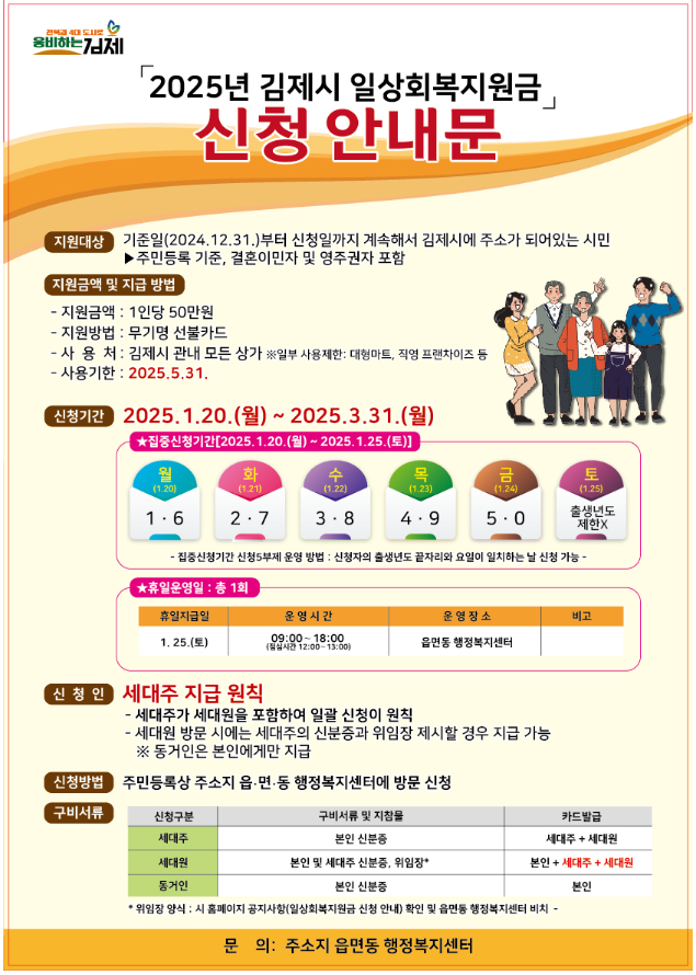 2025년 1월 20일부터 김제시에서는 1인당 50만 원의 일상회복지원금을 지급합니다. 김제시 일상회복지원금 신청자격 신청방법 신청조건에 대해서 알아보겠습니다.