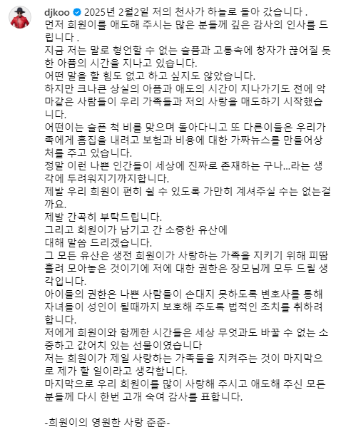구준엽은 자신의 SNS를 통해 서희원의 유산은 그녀가 생전에 사랑하는 가족을 위해 모은 것이기에 장모에게 돌아가는 것이 맞다고 밝혔습니다. 또 구준엽은 아이들이 받은 재산을 서희원 전 남편,시부모 혹은 다른 사람들이 손대지 못하도록 법적 조치를 취할 것이라고 덧붙였습니다.